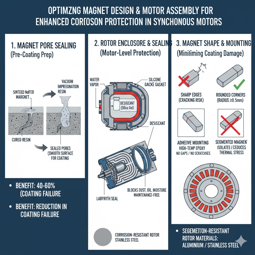 Samotné povrchové povlaky nestačí – výběr designu sestavy magnetu a motoru hraje zásadní roli při minimalizaci rizika koroze. Tyto optimalizace doplňují povlaky a prodlužují životnost magnetů: