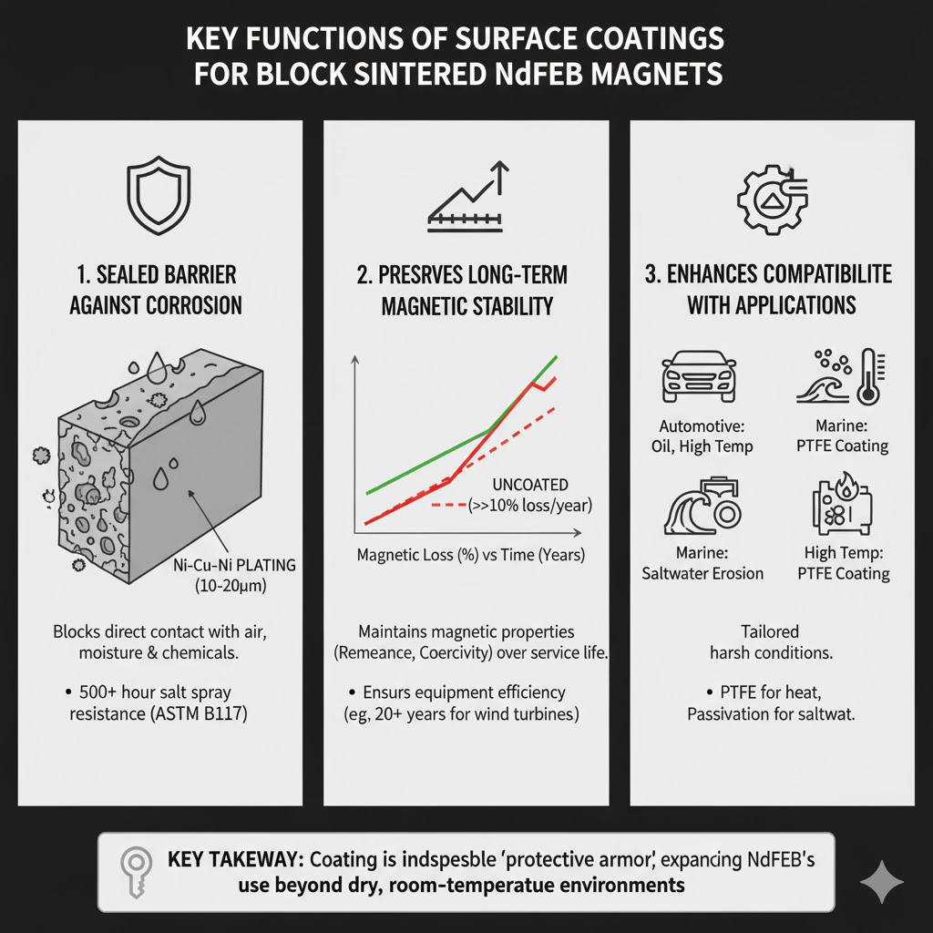 Pro Block Sintered NdFeB není povrchová úprava volitelným „upgradem“, ale základním „požadavkem“ pro realizaci jeho hodnoty. Jeho vlastní chemická reaktivita a porézní slinutá struktura činí korozi nevyhnutelnou bez ochrany – a koroze přímo ničí jak její strukturální integritu, tak magnetický výkon.