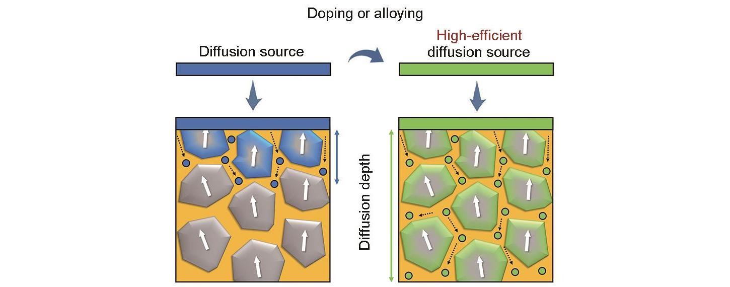 | Technologie difúze na hranicích zrn s nízkou hmotností vzácných zemin zahrnuje technologii difuze magnetronového naprašování a difuzní technologii sítotisku. Použití této techniky, která distribuuje nízkoobsahové těžké prvky vzácných zemin podél hranic zrn, zlepšuje defekty na hranicích zrn a dosahuje významného zvýšení Hcj. |